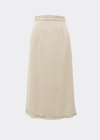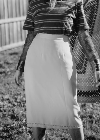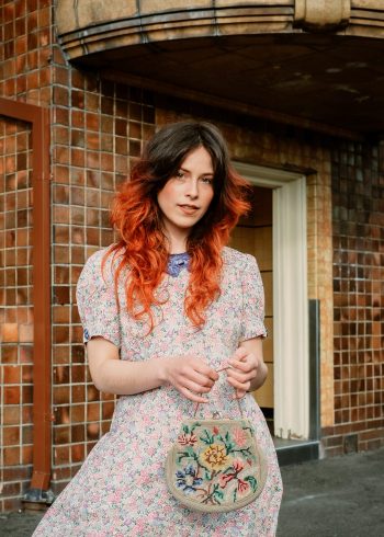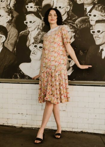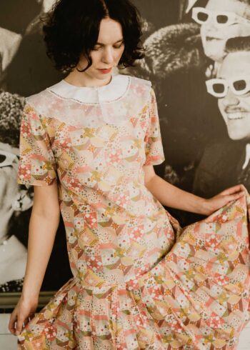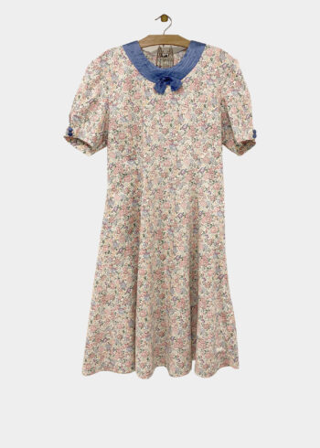 Simple pointed crisp collar, round neckline with easy to do button down the back. Dreamy puff sleeves, an elastic waist and a wind swept hand drawn print
