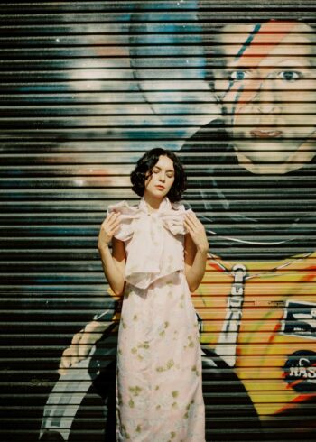Sixties spring blouse in a sweet lemon yellow print base of drawn retro florals. Retro long round collar and belled sleeves. The fabric is sheer and light weight, made from 65% Dacron polyester & 35% Cotton. Button through front & sleeve cuffs.