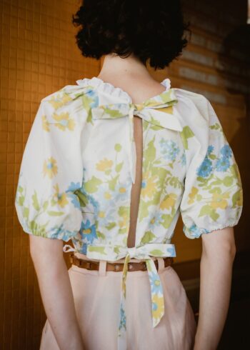 Short puff sleeves with open slits, closed hem. And a relaxed fit through the body. 100% Rayon, fabric in great condition. No manufacture labels