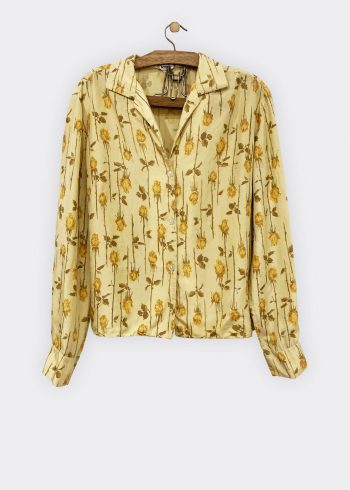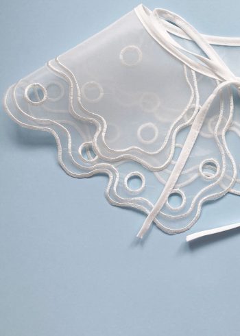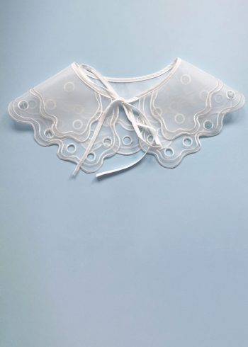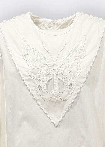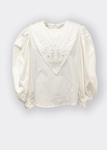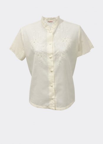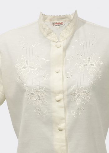 Embroidered linen cotton blend blouse. Delicate scalloped collar, puff sleeves and little pockets embroidered in a sweet cornflower blue. Decorated with flower motifs and blue buttons. 1940s inspired front and back darts. Cropped style.